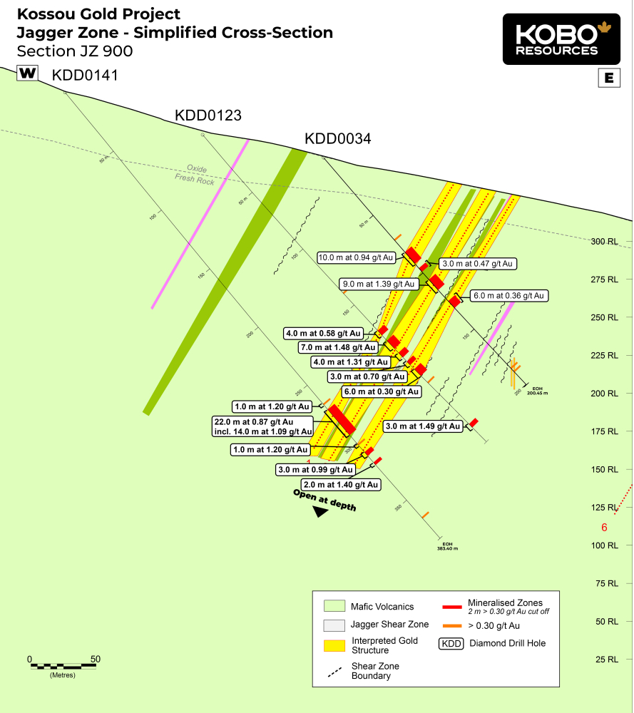 Edward Gosselin, CEO and Director of Kobo commented: “These results continue to confirm the strength and continuity of gold mineralisation within both the Jagger and Road Cut shear systems at our Kossou Gold Project. At the Road Cut Zone, drilling has extended mineralisation more than 150 m down-dip along the Contact Zone Fault, reinforcing its significance as a key structural control. At the Jagger Zone, broad zones of mineralisation and high-grade intercepts at depth continue to demonstrate the scale and vertical continuity of the system. Importantly, we remain highly encouraged that mineralisation remains open, and we will continue our systematic drilling strategy to expand both zones as we advance toward resource definition in 2026.”