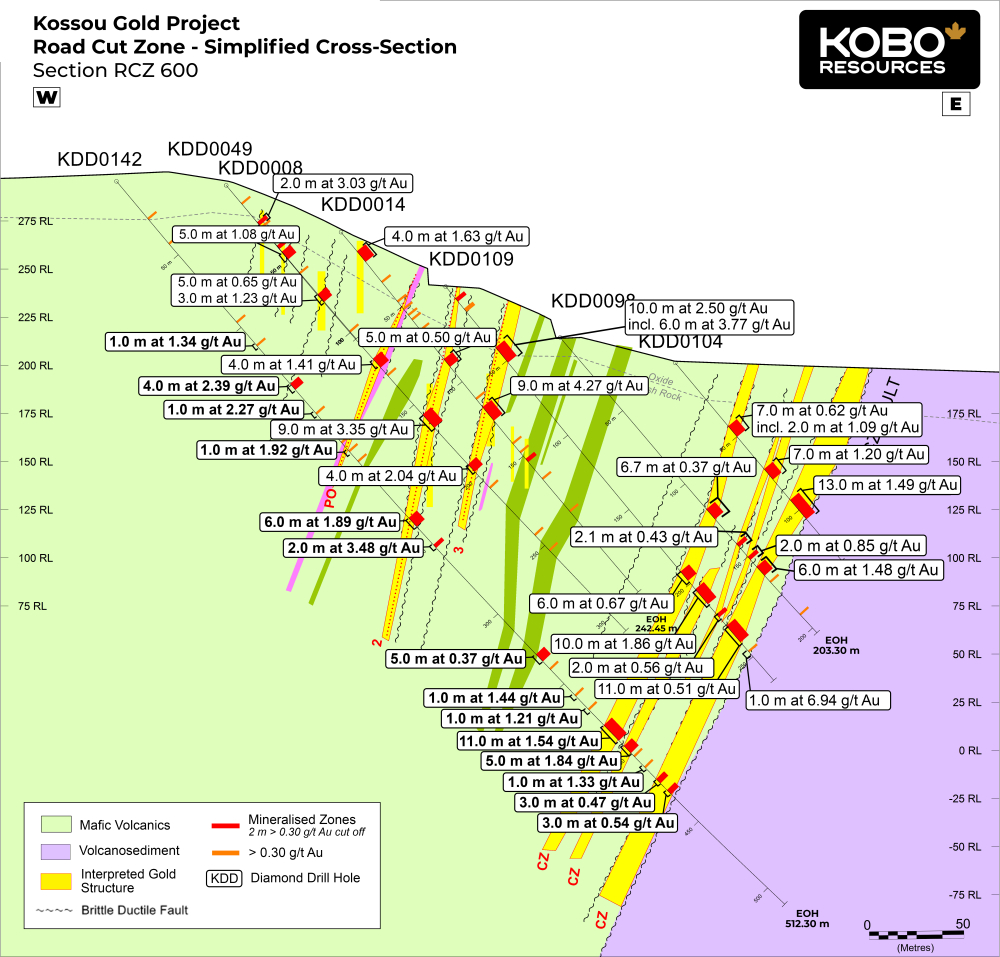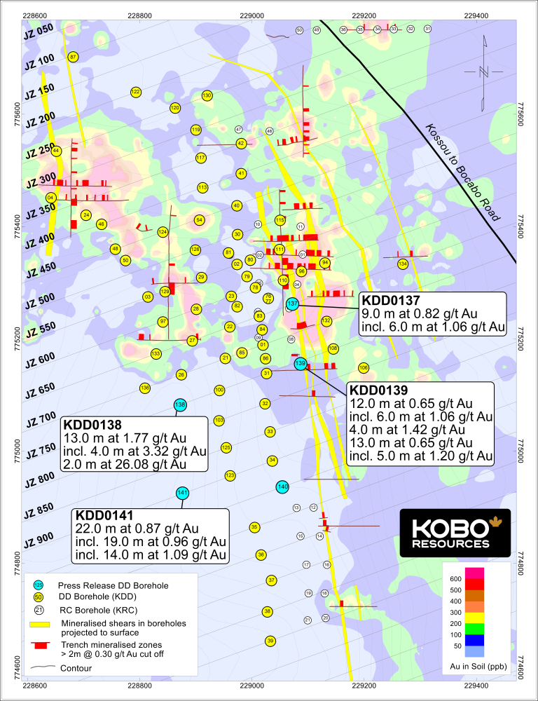 QUEBEC CITY, QC – Kobo Resources Inc. ("Kobo” or the "Company") (TSX.V: KRI) (FWB: Q1Z) is pleased to report diamond drill results from six additional holes completed at the Jagger and Road Cut Zones at its 100%-owned Kossou Gold Project (“Kossou”) in Côte d’Ivoire. The results confirm depth continuity within the established shear systems and extend mineralisation along the Contact Zone Fault.