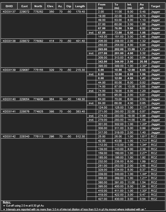 - Jagger Zone results confirm broad and continuous mineralisation at depth, highlighted by 13.0 m at 1.77 g/t Au and a high-grade interval of 2.0 m at 26.08 g/t Au (KDD0138)