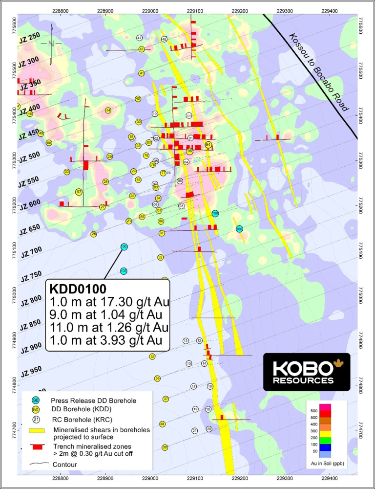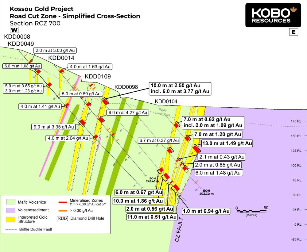 Kobo Resources Intersects 10.0 m at 2.50 g/t Au and 13.0 m at 1.49 g/t Au, Confirming Strong Gold Mineralisation Along the Contact Zone Fault at Kossou