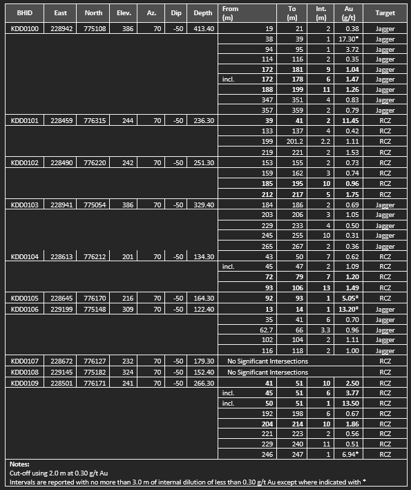 - KDD0109 intersected 10.0 m at 2.50 g/t Au from 41.0 m, including 6.0 m at 3.77 g/t Au from 45.0 m, as well as 10.0 m at 1.86 g/t Au from 204.0 m and 11.0 m at 0.51 g/t Au from 229.0 m.