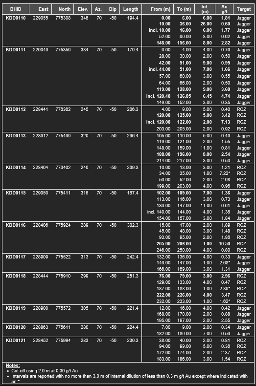 Mineralisation grading 8.0 m at 2.82 g/t Au (KDD0110) (see Figure 3), 9.0 m at 3.60 g/t Au (KDD0111) (see Figure 2) and 7.0 m at 1.36 g/t Au (KDD0115) was reported in Structure 6 at Jagger Zone in these boreholes. The mineralisation in KDD0110 is comparable to the mineralised intersection reported previously on the same drill section (borehole KDD0028 grading 8.0 m at 3.72 g/t Au).